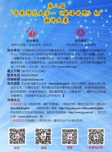 第八届“《英语世界》杯”翻译大赛得到华东师范大学的大力支持,并由该校冠名本届比赛。2017年的翻译大赛包含“英译汉”和“汉译英”两个组别。大赛初评交给合办院校的老师,以提升大赛评审的权威性和公信力。复评和终评我们将延续历届传统,从全国各地邀请知名翻译专家进行评审。
