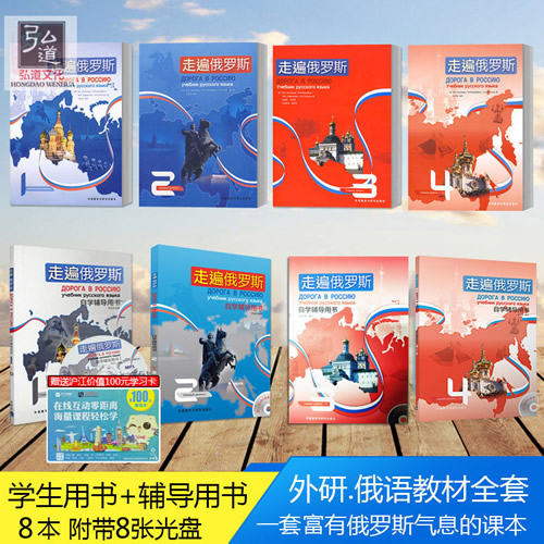 正版包邮 全套8本 走遍俄罗斯学生用书+自学辅导共8册 附8张光盘 俄语入门基础教材 俄语语法句型词汇 走遍俄罗斯 大学俄语教