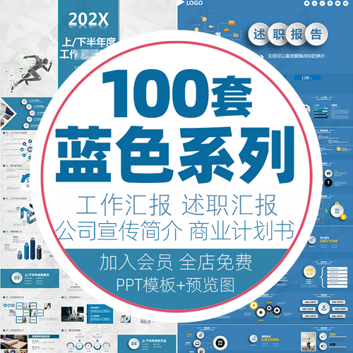 蓝色ppt模板 商务动态 简约工作汇报 年终年中总结 新年计划述职报告。